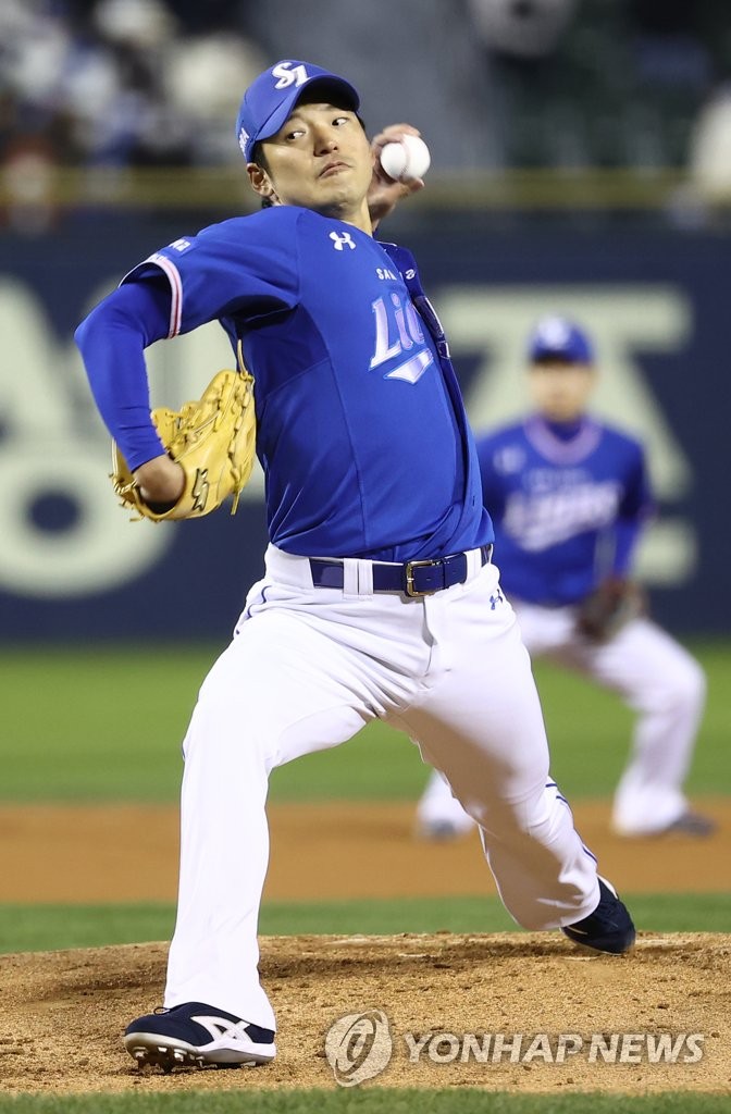| ▲ In this file photo from Nov. 10, 2021, Baek Jung-hyun of the Samsung Lions pitches against the Doosan Bears in the bottom of the first inning of Game 2 in the second round of the Korea Baseball Organization postseason at Jamsil Baseball Stadium in Seoul. (Yonhap) |