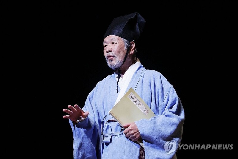 | ▲ 노최척 연기한 이호재 (서울=연합뉴스) 강민지 기자 = 11일 오후 서울 종로구 세종문화회관 M씨어터에서 열린 연극 '퉁소소리' 프레스콜에서 배우 이호재가 열연하고 있다. '퉁소소리'는 임진왜란과 정유재란 명청교체기의 주인공 최척의 여정을 담고 있다. 2024.11.11 mjkang@yna.co.kr |