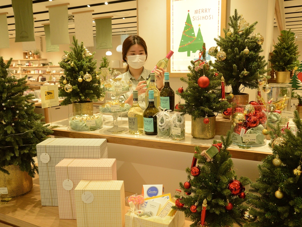 롯데백화점 부산본점은 지하 1층 '시시호시' 매장에 크리스마스 소품과 샴페인, 와인 등을 한자리에서 만나볼 수 있는 코너를 마련했다.