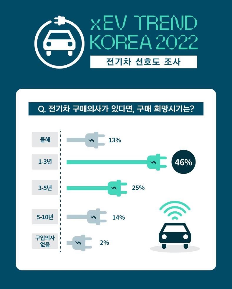 국내 대표 전기차 전시회인 'xEV 트렌드 코리아 2022' 사무국은 지난달 15일부터 이달 4일까지 성인남녀 2천98명을 대상으로 전기차 선호도에 대한 설문조사를 한 결과 이같이 파악됐다고 15일 밝혔다.