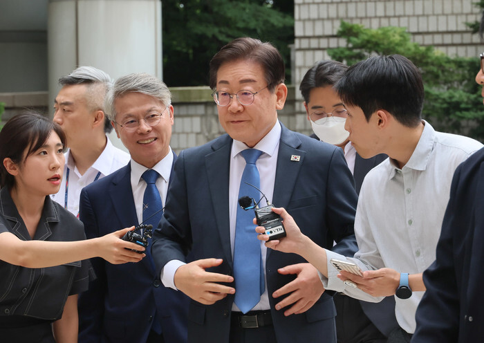 Lee Jae-myung (C), leader of the main opposition Democratic Party, is besieged by reporters upon arriving at the Seoul Central District Court in the capital on July 12, 2024, to attend a hearing on his alleged election law violations for making false statements during his presidential campaign in 2021. (Yonhap)