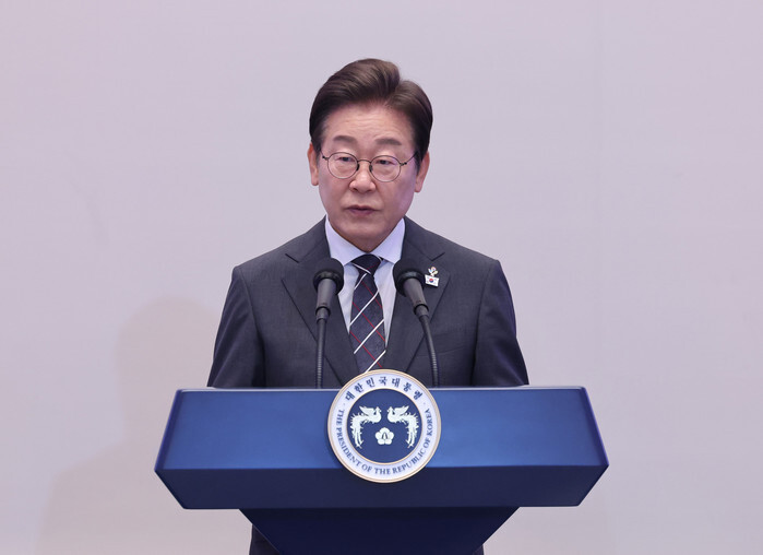 President Lee Jae Myung speaks during a luncheon meeting for people of national merits, war veterans, bereaved families and representatives of veterans' organizations at the former presidential office, Cheong Wa Dae, in Seoul on June 27, 2025. (Yonhap)