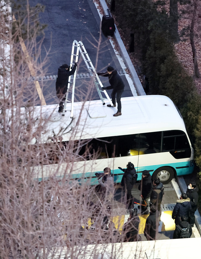 Investigators from the police set up a ladder on the premises of impeached President Yoon Suk Yeol's official residence in Seoul on Jan. 15, 2025, after police and the anti-corruption agency began their second attempt to execute a warrant to detain Yoon in connection to his short-lived imposition of martial law. (Yonhap)
