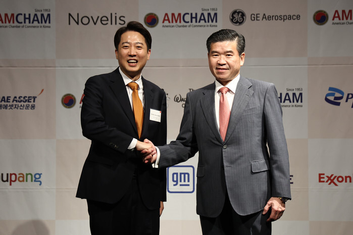 New Reform Party presidential candidate Lee Jun-seok (L) shakes hands with James Kim, chairman and CEO of AMCHAM, during an event at the Grand Hyatt Seoul on May 22, 2025. (Yonhap)