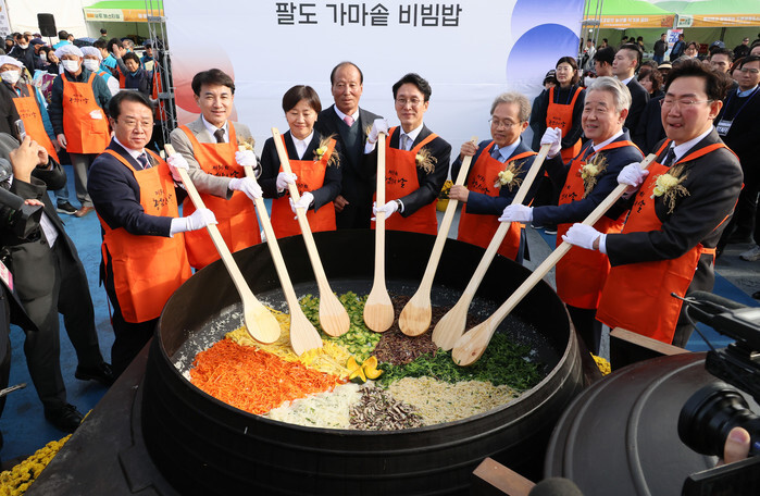 Prime Minister Kim Min-seok (4th from R) and Agriculture Minister Song Mi-ryung (3rd from L) work together to combine ingredients for "bibimbap," a traditional Korean dish made with vegetables, sliced beef, steamed rice and hot pepper paste, during a ceremony to mark Farmers Day in Wonju, the capital of South Korea's northeast province of Gangwon, on Nov. 11, 2025. (Yonhap)