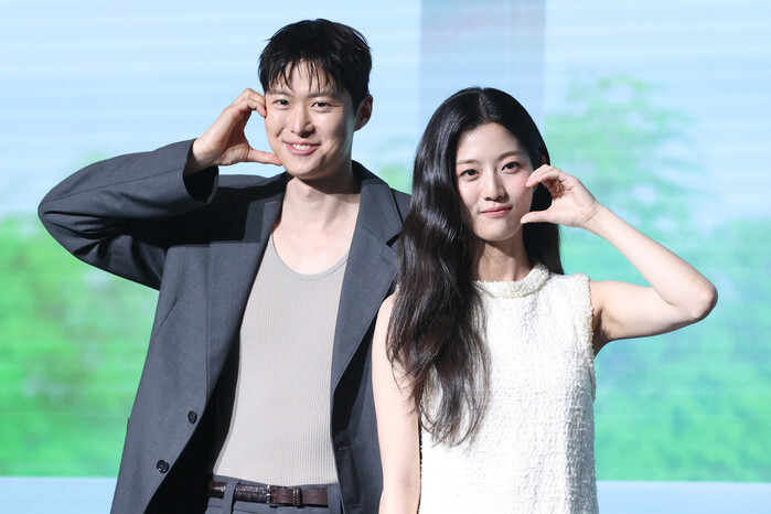 South Korean actress Shin Eun-soo and actor Gong Myung, who star in the new movie "Love Untangled," an original movie by Netflix, pose for a photo during a publicity event in Seoul on Aug. 25, 2025. The movie will be released worldwide on Aug. 29. (Yonhap)