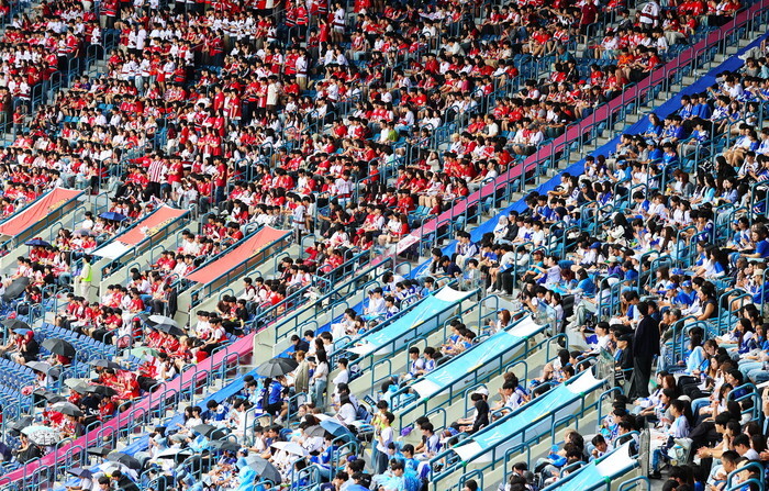 Students of Korea University (in red) and Yonsei University (in blue) cheer during a baseball game at Jamsil Baseball Stadium in Seoul on Sept. 19, 2025, the first day of the two-day competition between the two private schools. They hold the competition every year, with baseball, basketball, ice hockey, rugby and football matches. (Yonhap)