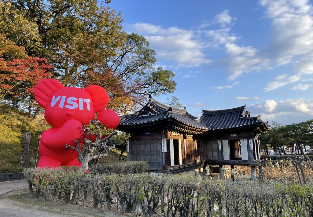 (강릉=연합뉴스) 국가민속문화재 제5호인 강릉 선교장 내 활래정에 지난 3일부터 임지빈 작가의 작품 '베어벌룬'이 설치돼 눈길을 끌고 있다.