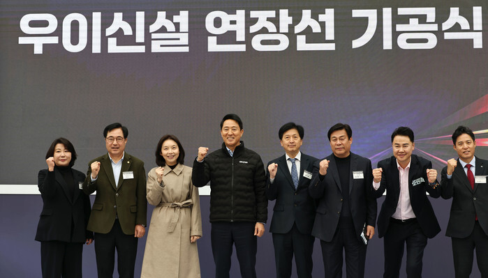 Seoul Mayor Oh Se-hoon (4th from L) and dignitaries attend a groundbreaking ceremony for the extension of the Ui-Sinseol Light Rapid Transit line in northern Seoul on Nov. 24, 2025. (Yonhap)