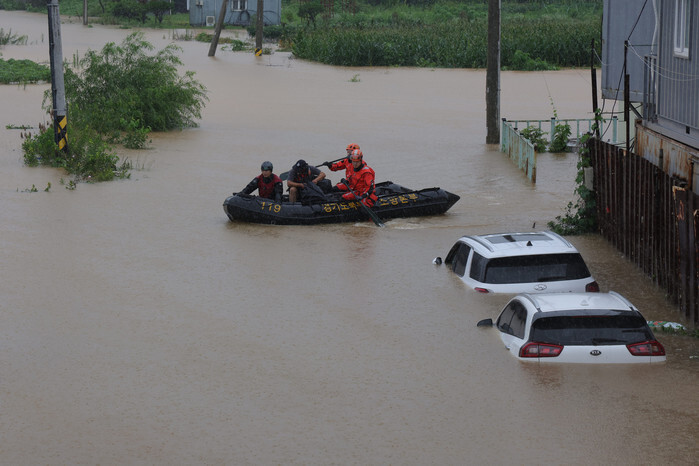Firefighters work to rescue workers isolated in a factory submerged by heavy downpours in Paju, 37 kilometers northwest of Seoul, on July 18, 2024. (Yonhap)