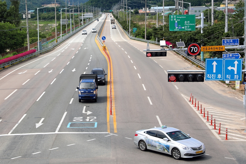 감응신호시스템은 국도 44호선 동홍천∼북면 한계삼거리 관벌교차로 47㎞ 구간 15개 교차로와 국도 46호선 북면 용대리 19㎞ 구간 7개 교차로 등 22곳에 설치됐다.