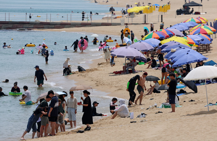 Vacationers cool off at a beach in Gangneung, about 170 kilometers east of Seoul, on July 6, 2025, as South Korea grapples with a heat wave. (Yonhap)