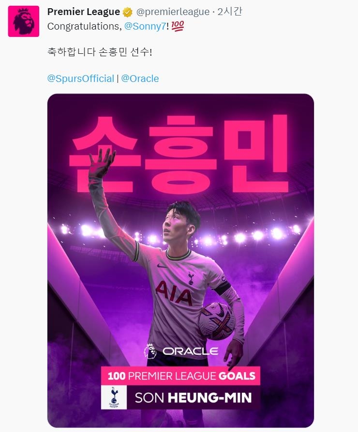 (서울=연합뉴스) 최송아 기자 = 세계 최고의 프로축구 리그로 꼽히는 잉글랜드 프리미어리그(EPL)가 아시아 선수 최초로 100골을 돌파한 손흥민(토트넘)을 '한글'로 축하했다.