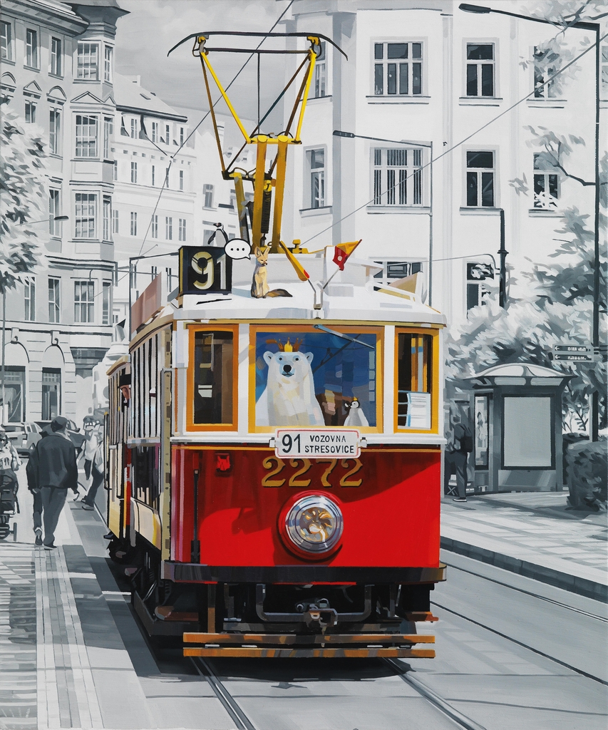 중국 베이징을 기반으로 활동해온 정성준은 인간과 자연의 공존이라는 주제 아래 세계 도시의 트램과 동물들이 등장하는 그림을 그려왔다. 동물들이 타고 유토피아를 찾아 떠나는 트램의 다채로운 색감과 배경의 무채색 인간 세상이 대비된다.