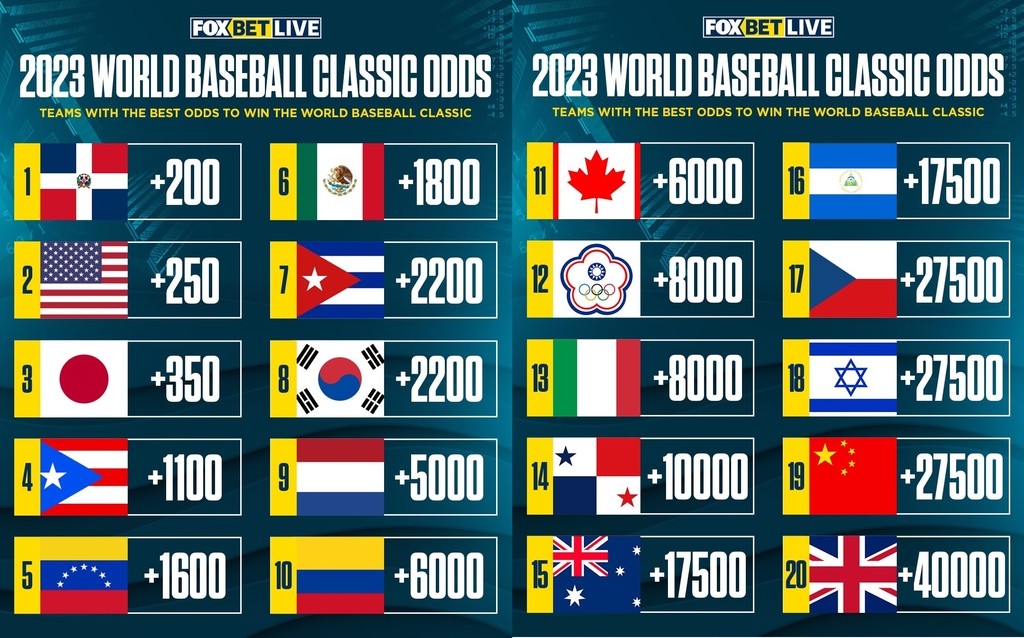 우승 가능성이 가장 높은 나라는 빅리거를 다수 거느린 도미니카공화국으로 '+200'이 책정됐다. 2013년 3회 WBC 우승국이다.