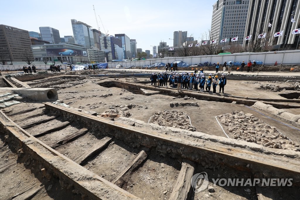 | ▲ Citizens look around an excavation site for the restoration of a "woldae" in front of Gwanghwamun, the main gate of Gyeongbok Palace, in downtown Seoul, in this March 16, 2023, file photo. Tramways, built during the Japanese colonial rule of Korea (1910-45), were discovered there. (Yonhap) |