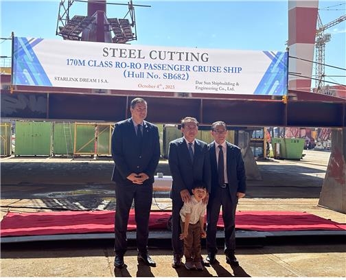 착공식은 김현겸 팬스타그룹 회장 등 임직원과 이수근 대선조선 부회장이 참석한 가운데 리본 커팅, 강재 절단, 공정 단계 확인서 전달 순으로 진행됐다.