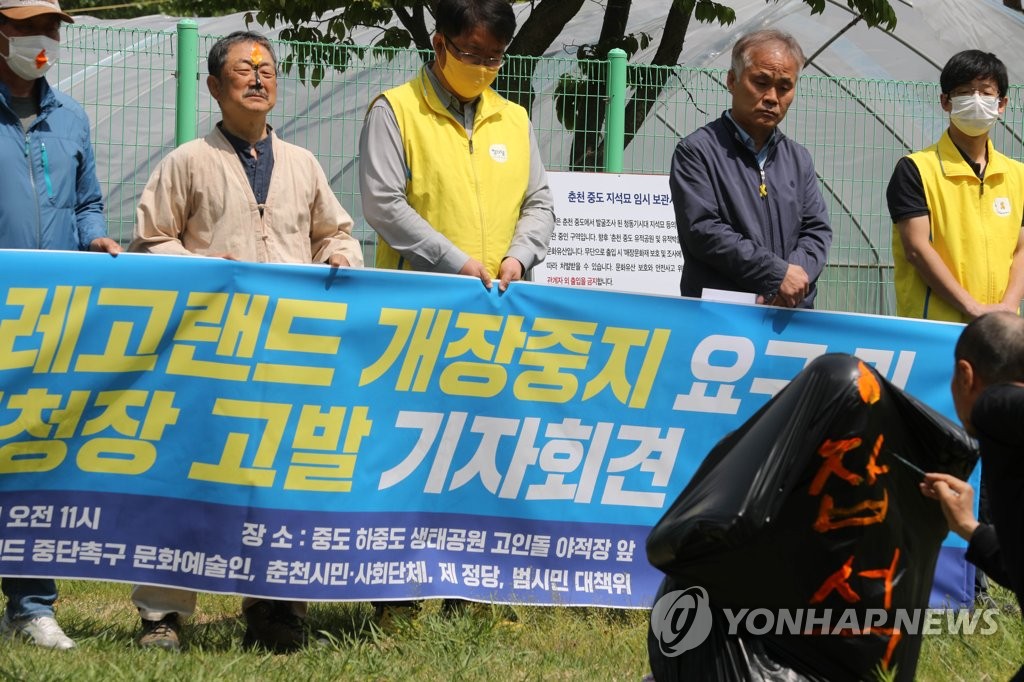 (춘천=연합뉴스) 박영서 기자 = 춘천 레고랜드 테마파크 조성사업에 반대하는 시민사회단체들이 "유적공원 조성 등 조건부 승인 사항을 하나도 이행하지 않은 상태에서의 레고랜드 개장은 불법"이라며 문화재청을 직무유기 등으로 2일 고발했다.