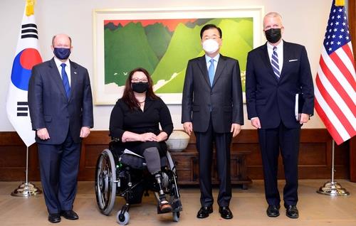 | ▲ This file photo, taken June 4, 2021, shows then Foreign Minister Chung Eui-yong (3rd from L) posing for a photo with (L to R) U.S. Sens. Chris Coons, Tammy Duckworth and Dan Sullivan, who visited South Korea for talks with parliamentary and other officials here, during a meeting at Chung's official residence. (PHOTO NOT FOR SALE) (Yonhap) |