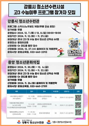 청소년수련관에서는 겨울 대표 동계 스포츠인 스키와 스노보드 체험 'Exciting Winter'를, 북부청소년문화의집에서는 청소년 드림 뮤지컬 '버닝업'팀의 초청공연을 통해 수험생들의 지친 마음을 위로하는 '우리들의 행복한 시간'이 29일부터 진행된다.