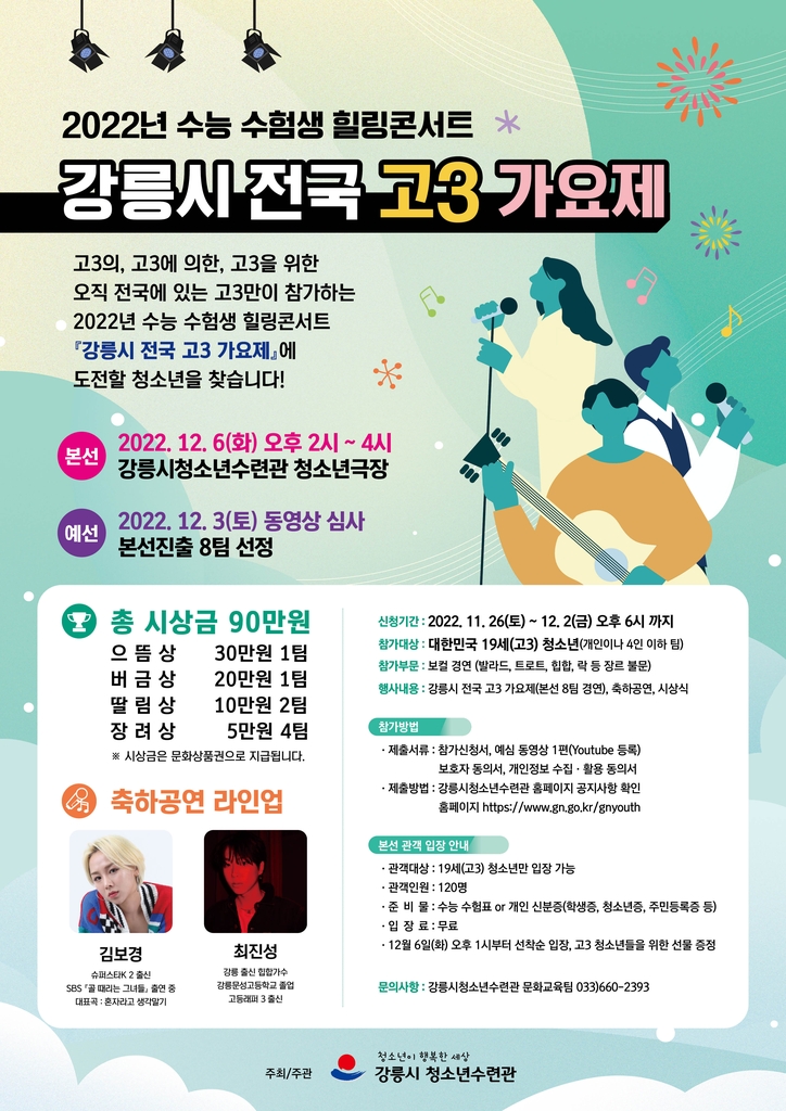 (강릉=연합뉴스) 유형재 기자 = 강원 강릉시는 수능시험을 마친 고3 학생을 위해 오는 6일 청소년수련관 청소년극장에서 2022년 수능 수험생 힐링 콘서트 '강릉시 전국 고3 가요제'를 개최한다고 2일 밝혔다.