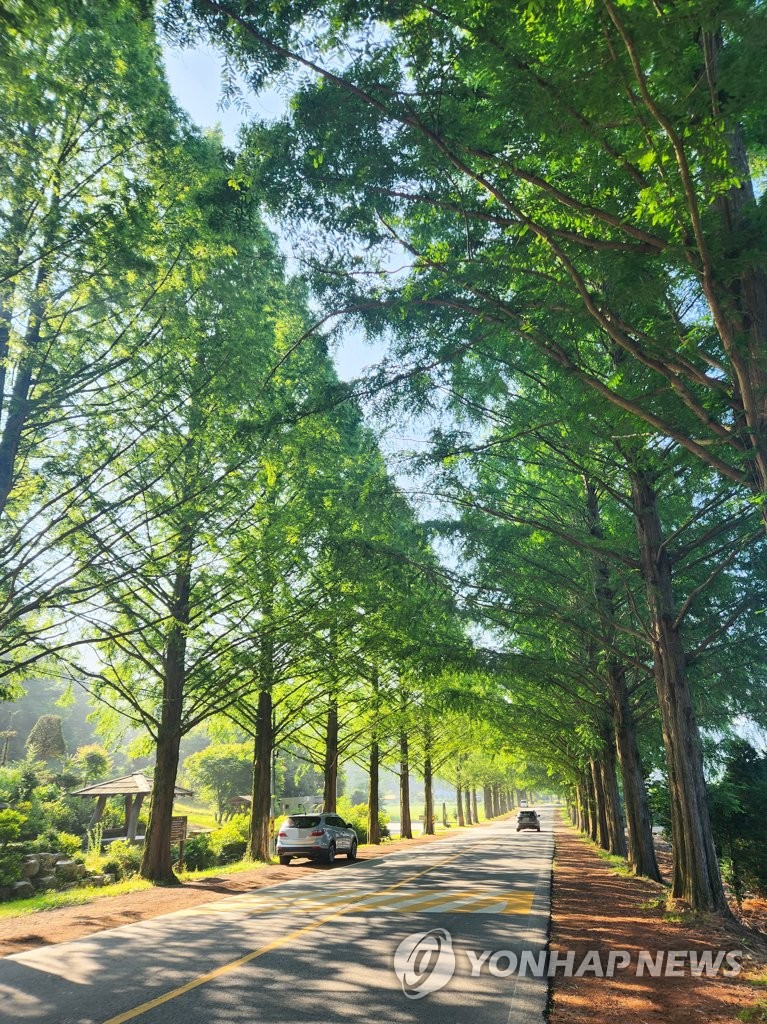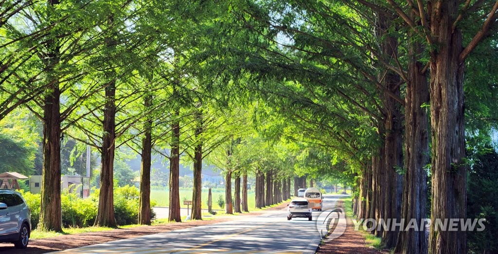 (진안=연합뉴스) 초여름 날씨를 보인 16일 전북 진안군 부귀면 메타세쿼이아 길이 초록빛 싱그러움으로 가득 차 있다.