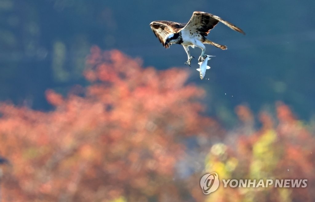 (강릉=연합뉴스) 유형재 기자 = 단풍이 한창인 가을이면 강원 강릉시 남대천은 물고기 사냥꾼 물수리의 마당이 되는 곳이다.
