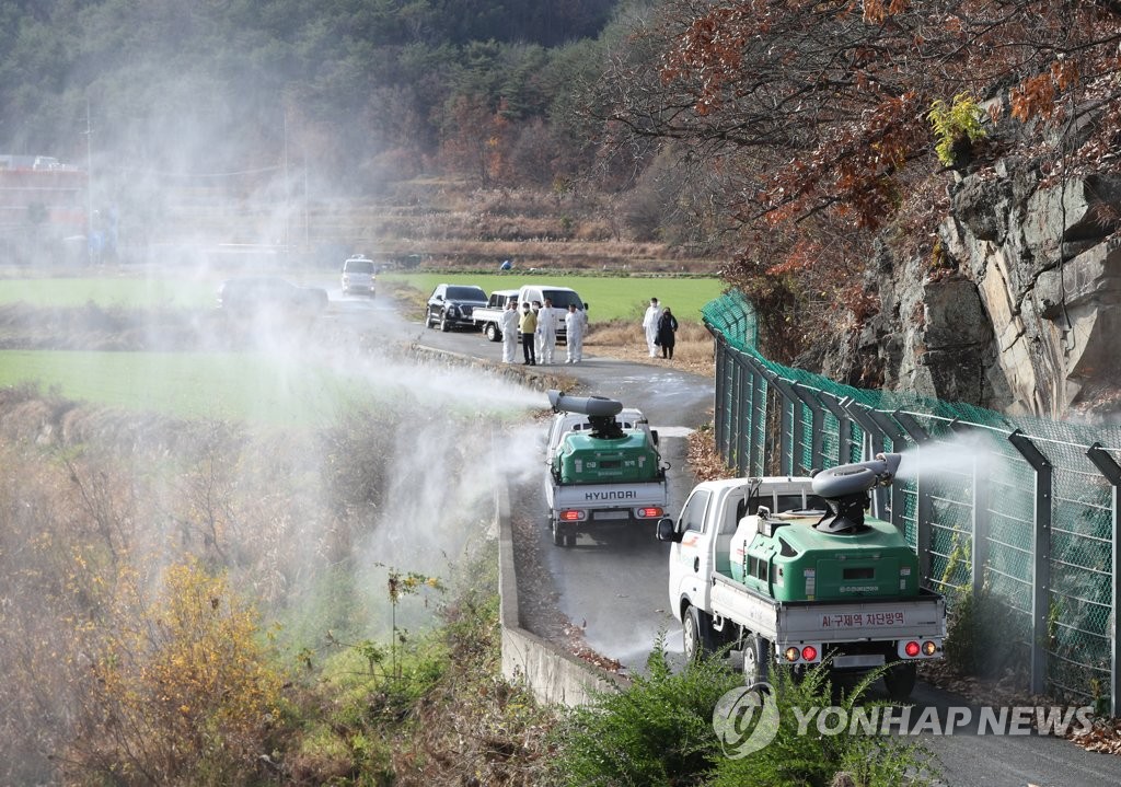 | ▲ Quarantine vehicles disinfect Samdong district in Ulju, 414 kilometers southeast of Seoul, on Nov. 21, 2022, after a highly pathogenic strain of H5N1 of avian influenza was found from wild birds' excrement collected near the area. (Yonhap) |