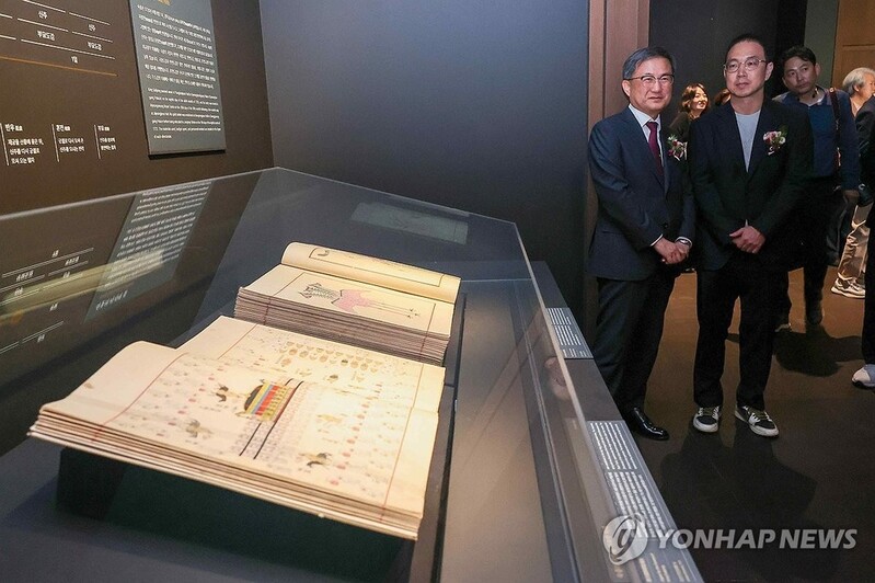 | ▲ 외규장각 의궤실 둘러보는 김재홍 관장과 송병준 의장 (서울=연합뉴스) 서대연 기자 = 김재홍 국립중앙박물관장과 국립중앙박물관회 젊은 친구들(YFM) 위원장인 송병준 컴투스 의장이 14일 오전 서울 용산구 국립중앙박물관 외규장각 의궤실을 둘러보고 있다. 국립중앙박물관은 15일부터 외규장각 의궤 전용 전시실을 공개한다고 밝혔다. 2024.11.14 dwise@yna.co.kr |