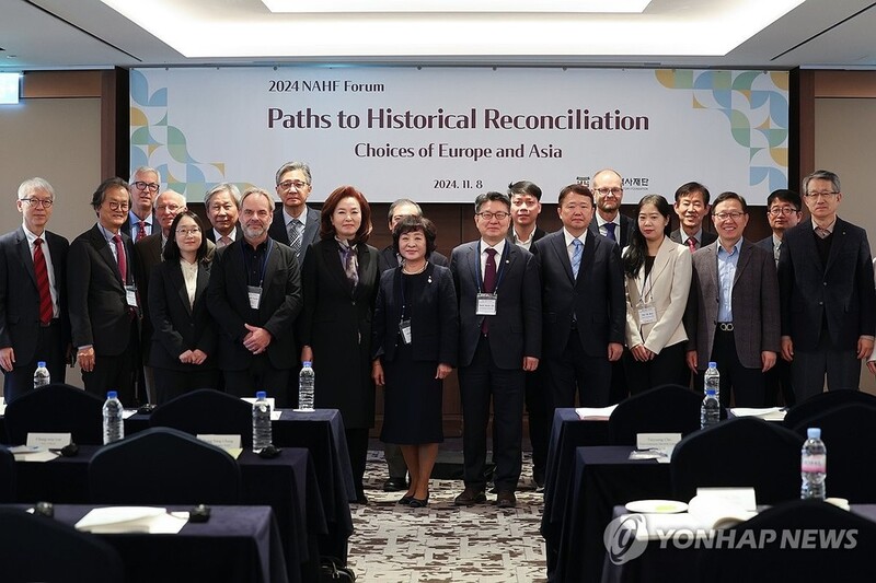 | ▲ 2024 동북아역사재단 포럼 기념촬영 (서울=연합뉴스) 임화영 기자 = 박지향 동북아역사재단(NAHF) 이사장, 오석환 교육부 차관, 국민의힘 김민전 의원 등 참석자들이 8일 오전 서울 중구 롯데호텔에서 '역사 화해의 길: 유럽과 아시아의 선택'을 주제로 열린 2024 동북아역사재단 포럼에서 기념 촬영을 하고 있다. 2024.11.8 hwayoung7@yna.co.kr |
