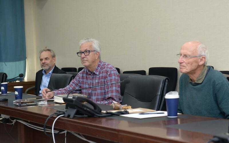 | ▲ 인터뷰하는 전문가들 왼쪽부터 에카르트 푹스 독일 라이프니츠 교육미디어연구소장, 팔크 핑엘 전 게오르크 에커르트 교과서 연구소 부소장, 월터 해치 미국 콜비 칼리지 명예교수 |