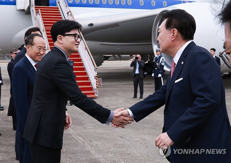 | ▲ President Yoon Suk Yeol (R) shakes hands with Han Dong-hoon, leader of the ruling People Power Party, at Seoul Air Base in Seongnam, south of Seoul, on Nov. 14, 2024, before his departure for Peru to attend the Asia-Pacific Economic Cooperation summit. (Yonhap) |