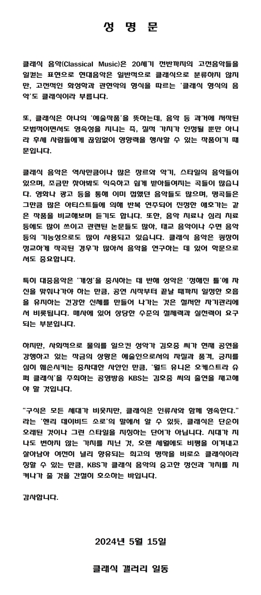이들은 지난 15일 온라인 클래식 커뮤니티인 'DC인사이드 클래식 갤러리'에 성명을 게재하고 "사회적으로 물의를 일으킨 성악가 김호중 씨가 공연을 강행하고 있는 작금의 상황은 예술인으로서의 자질과 품격, 긍지를 심히 훼손시키는 중차대한 사안"이라며 "KBS가 클래식 음악의 숭고한 정신과 가치를 지켜나가 줄 것을 간절히 호소한다"고 밝혔다.
