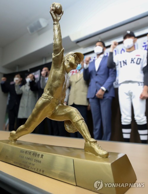 | ▲ 2020년 최동원상 수상자들과 함께 (서울=연합뉴스) 김도훈 기자 = 19일 오후 서울 강남구 야구회관에서 열린 제7회 부산은행 최동원상 및 제3회 대선고교 최동원상 시상식에서 두산 베어스의 라울 알칸타라(오른쪽 두 번째)와 인천고 윤태현(오른쪽) 등이 시상식이 끝난 뒤 관계자들과 함께 기념촬영을 하고 있다. 2020.11.19 superdoo82@yna.co.kr |