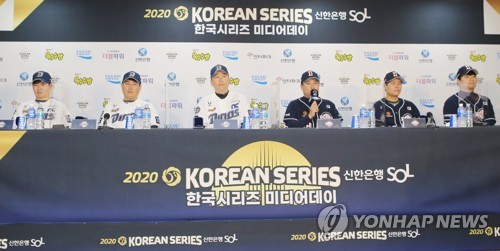 | ▲ 두산-NC, 한국시리즈 기자회견 (서울=연합뉴스) 홍해인 기자 = 16일 오후 서울 구로구 고척스카이돔에서 열린 2020 프로야구 포스트시즌 한국시리즈(KS) 미디어데이에서 두산 베어스와 NC 다이노스 양팀 감독과 선수들이 기자회견을 하고 있다. 왼쪽부터 NC 다이노스 2루수 박민우, 포수 양의지, 이동욱 감독, 두산 베어스 김태형 감독, 포수 박세혁, 투수 이영하. 2020.11.16 hihong@yna.co.kr |