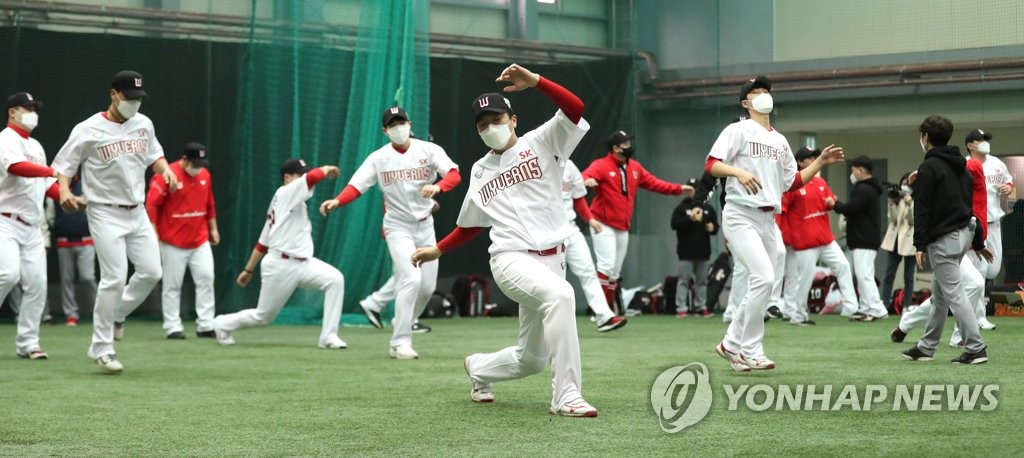 | ▲ Members of the SK Wyverns train at Kang Chang-hak Baseball Stadium in Seogwipo, Jeju Island, during spring training on Feb. 1, 2021. (Yonhap) |