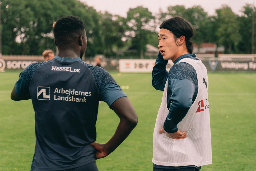 | ▲ 훈련 도중 팀 동료와 대화하는 조규성 [미트윌란 페이스북 캡처. 재판매 및 DB 금지] |