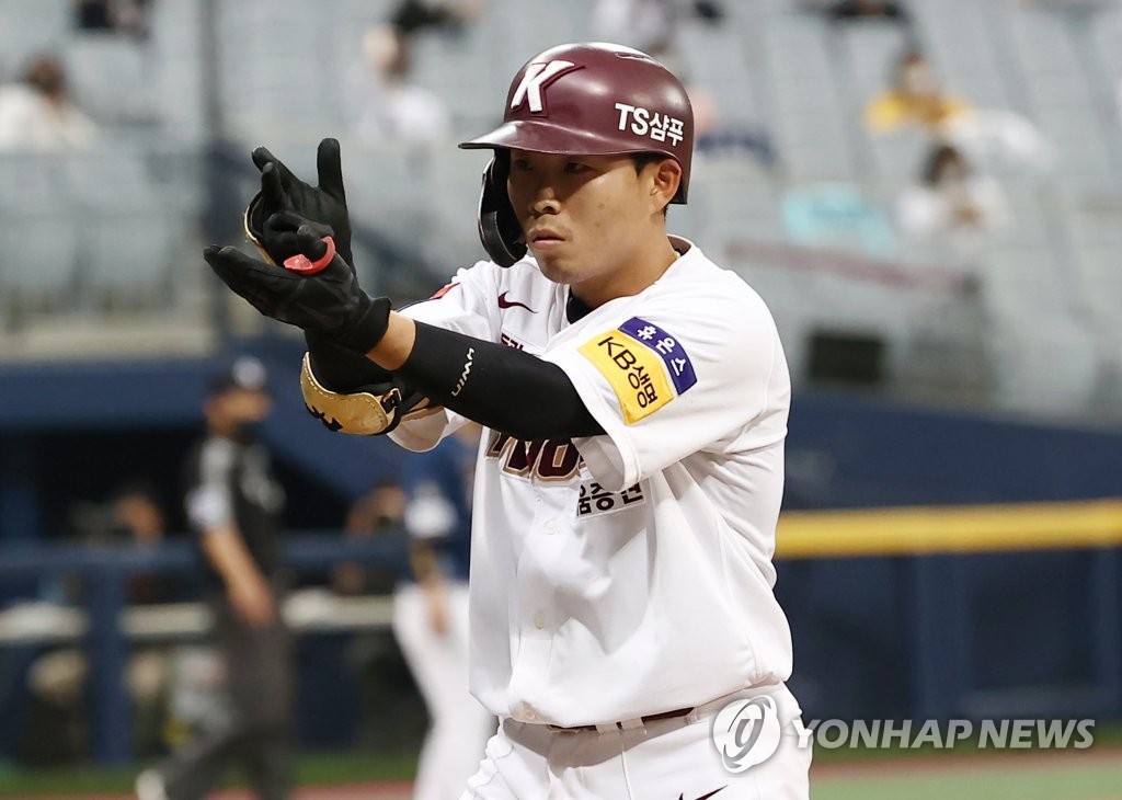 | ▲  In this file photo from May 23, 2021, Song Woo-hyun of the Kiwoom Heroes celebrates a hit against the NC Dinos in the bottom of the fourth inning of a Korea Baseball Organization regular season game at Gocheok Sky Dome in Seoul. (Yonhap) |