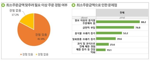 조사대상 중 82.8%는 최소 주문금액을 맞추기 위해 필요 이상으로 주문한 경험이 있다고 답했다. 또 82%는 배달 비용을 누가 부담하는지 명확하게 공지가 이뤄져야 한다고 지적했다.
