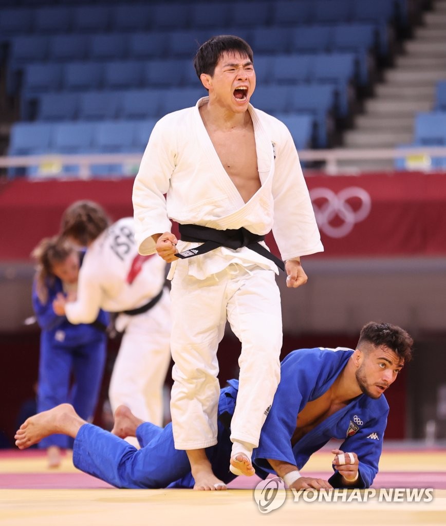 | ▲ [올림픽] 안창림 '이겼다!' (도쿄=연합뉴스) 김인철 기자 = 26일 일본 도쿄 지요다구 무도관에서 열린 도쿄올림픽 유도 남자 73kg급 32강 경기에서 안창림이 파비오 바실(이탈리아)을 상대로 승리한 후 환호하고 있다. 2021.7.26 yatoya@yna.co.kr |