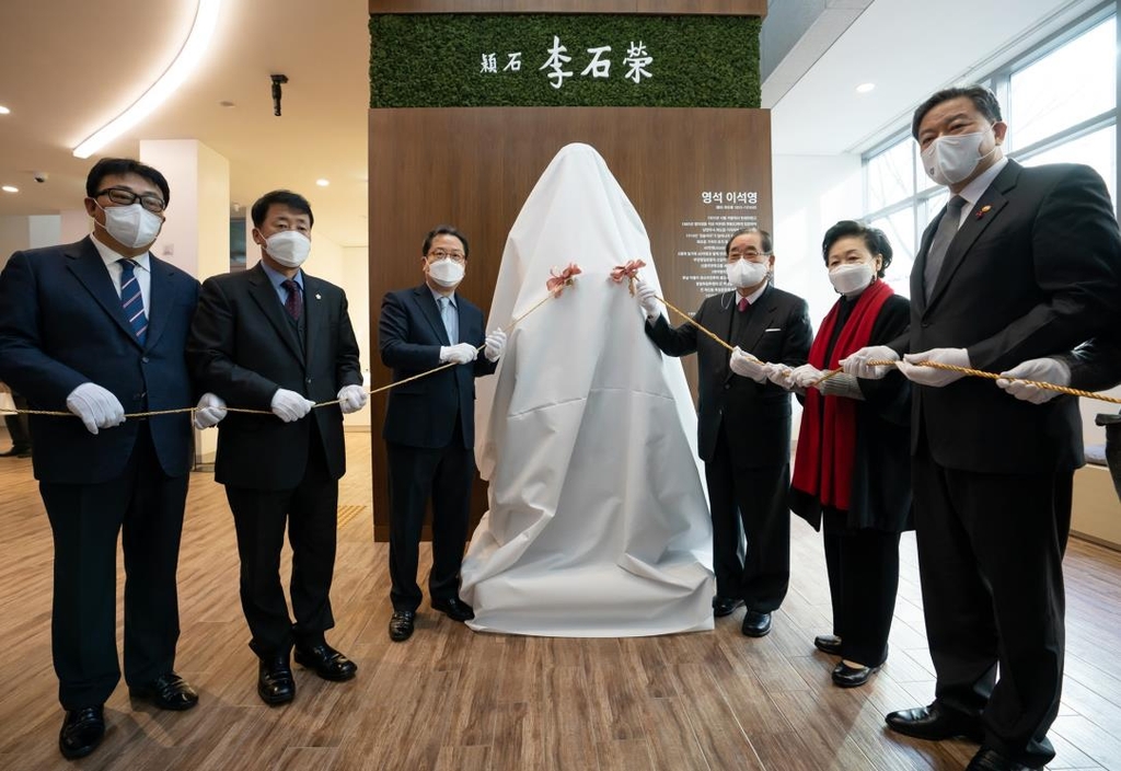 | ▲ 이석영 선생 흉상 제막 (남양주=연합뉴스) 경기 남양주시는 14일 이석영 뉴미디어 도서관 개관식에서 1층에 설치한 이석영 선생의 흉상도 제막했다. 2021.1.14 [남양주시 제공. 재판매 및 DB 금지] |