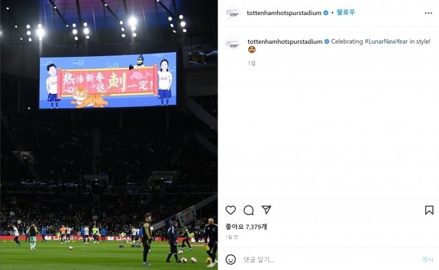 이날 경기장 전광판에는 춘제 축하 메시지와 함께 토트넘 여성 축구팀 '토트넘 위민'에서 뛰는 중국인 선수 탕지아리와 손흥민 선수의 캐리커처가 떴다.