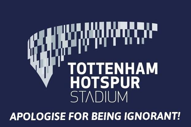 | ▲ 토트넘 스타디움 로그를 사용한 항의 포스터. '무지에 대해 사과하라'고 썼다 [반크 제공] |