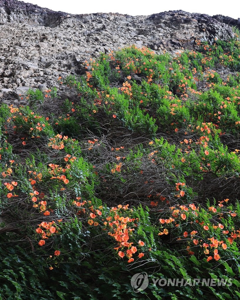 | ▲ 마이산 절벽에 핀 능소화 (진안=연합뉴스) 전북 진안군 마이산 탑사 절벽에 능소화가 만개했다. 2021.7.14 [진안군 제공. 재판매 및 DB 금지] kan@yna.co.kr |