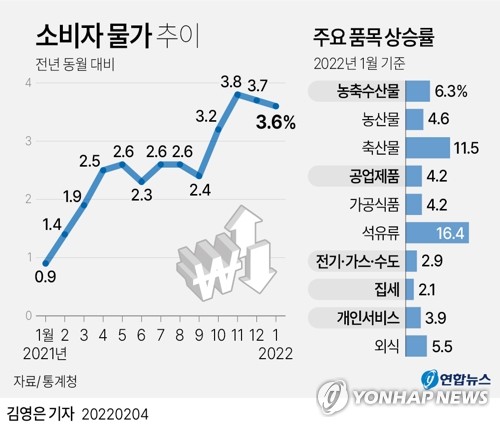 | ▲ [그래픽] 소비자물가 추이 (서울=연합뉴스) 김영은 기자 = 통계청은 1월 소비자물가지수가 104.69(2020=100)로 지난해 같은 달보다 3.6% 상승했다고 4일 발표했다. 0eun@yna.co.kr 트위터 @yonhap_graphics 페이스북 tuney.kr/LeYN1 인스타그램 @yonhapgraphics |