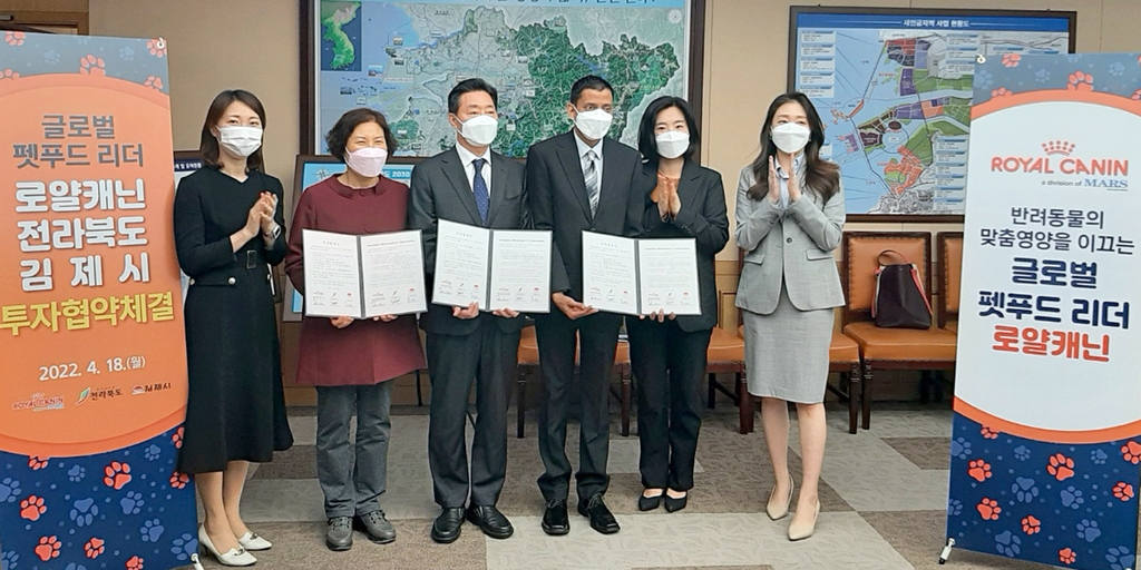 로얄캐닌코리아는 이날 전북도청에서 연 투자 협약식에서 2025년까지 2천100억원을 추가로 투자해 지평선산업단지 내 김제공장 생산라인을 배 이상 확대하기로 했다.