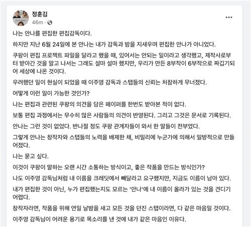 | ▲ 김정훈 편집감독 입장문 [김정훈 페이스북 캡처. 재판매 및 DB 금지] |