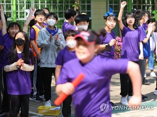 | ▲ Some students without masks take part in an athletic meet at an elementary school in Seoul on May 2, 2022, as the country allowed people to take masks off outside starting the same day amid a decreasing trend in the number of daily COVID-19 cases. |