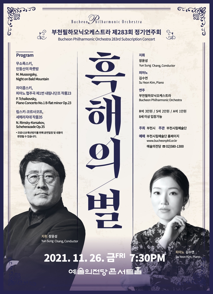 부천필 상임지휘자인 장윤성 지휘로 무소륵스키 '민둥산의 하룻밤', 차이콥스키 피아노 협주곡 제1번, 림스키-코르사코프 '세헤라자데'를 연주한다.