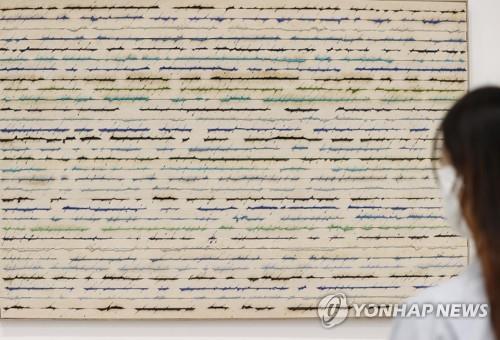 | ▲ (서울=연합뉴스) 이재희 기자 = 15일 오전 서울 종로구 국제갤러리에서 열린 하종현 개인전에서 관계자가 작품을 살펴보고 있다. 2022.2.15 |